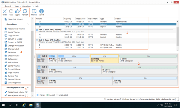 Download this partition software in Windows 2019 server (physical or virtual machine), you'll see the main window with 5 sections.