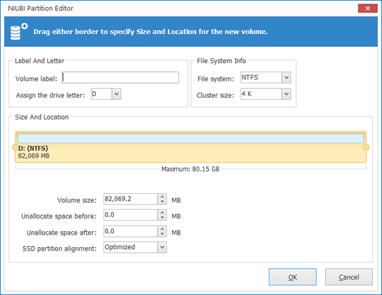 Tips: if you want to create several partitions with Unallocated space, you can drag either border in the middle or enter an amount in "Volume size" on the bottom.